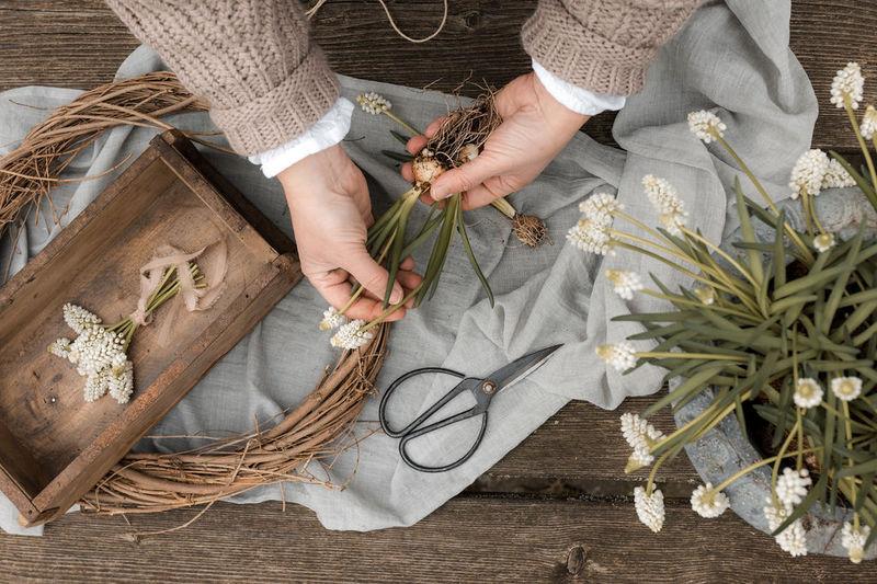 Bindet wahlweise und jahreszeitenabhängig Haarkränze, hoops in unterschiedlichen Durchmessern, kompakte dicke Türkränze, feine Wandkränze oder Armbänder.